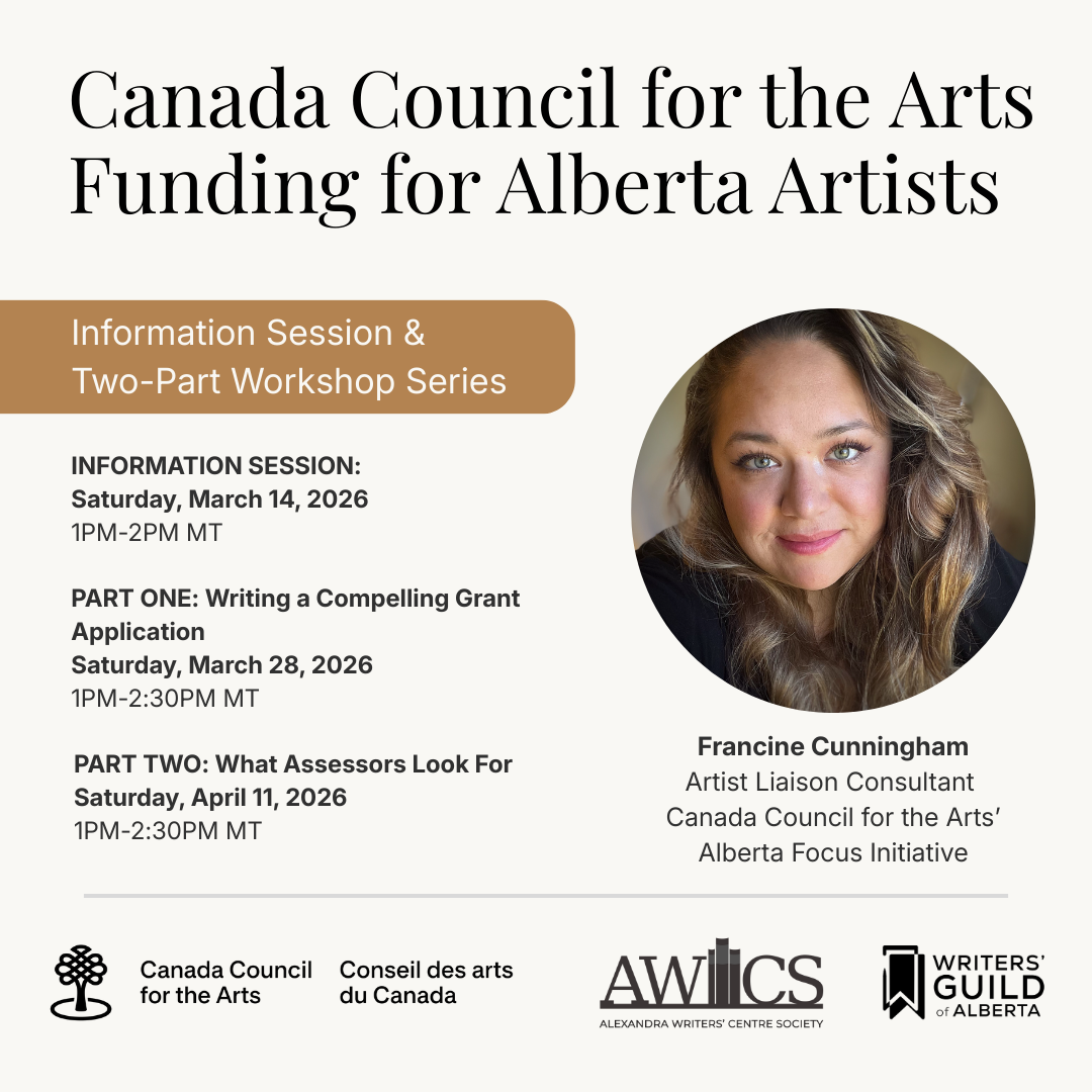 This event is brought to you by the Alexandra Writers’ Centre Society (AWCS), the Writers’ Guild of Alberta (WGA), and the Canada Council for the Arts.