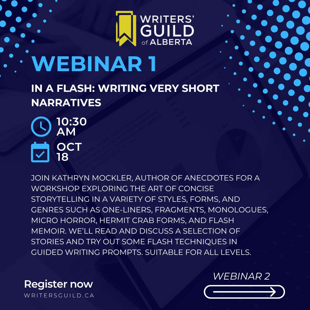 18oct10:30 amIn a Flash: Writing Very Short Narratives Workshop with Kathryn Mockler (Online)10:30 am(GMT-06:00)