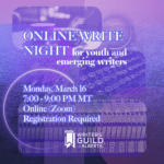 March 16, 2026 7:00 PM – 9:00 PM MT Online (Zoom)Registration is required Join fellow youth and emerging writers online for a dedicated session for writers to focus, chat, and share progress, and where all writing is welcome (including academic and personal writing!). The WGA welcomes anyone who feels they fit into this description and wants to chip away at their project for an hour or two. There will be some optional prompts as well if you’d like some guidance
