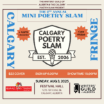 Fringe Festival Mini Poetry Slam Sunday, August 3rd, 20259:30 PM to 11:15 PMFestival Hall1215 10th Ave SE Tickets are $22 and available here.*selected participants will have their cover charge refunded Join us for the second annual mini Poetry Slam at Calgary Fringe Festival this summer! Hosted by Calgary Poetry Slam’s Matt Miller. Sign-up starts at 9:30pm.Participants announced at 9:45pm.Show starts at 10:00pm. This is a mini version of the Calgary Poetry Slam. Six performers will be selected by random draw and will each