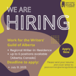 Writers’ Guild of Alberta Employment Opportunity: Regional Writer-in-Residence (6 Positions Available) The Writers’ Guild of Alberta invites all those qualified to apply for the position of Regional Writer-in-Residence (RWiR). There are up to 6 positions available. Alberta regions we are looking to include this year are Grande Prairie, Fort McMurray, Lethbridge, Red Deer, Greater Edmonton, and the Greater Calgary areas. This program provides WGA members access to the services of a Virtual RWiR, with priority given to those who cannot