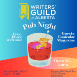 WGA June Pub Night (Edmonton)Wednesday, July 16, 20257-9pm MTRooster Bar & Kitchen, 10732 Whyte aveEdmontonFREE Join the WGA for our July pub night, with special guests, contributors from Edmonton literary magazine Funicular. Past and present contributors such as Mika Deneige, Jamie Boakee, Robyn Braun, and Theodora Sterling. As always, the open mic starts at 8pm. This is a free event. All are welcome!