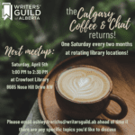 The Calgary Coffee & Chat Saturday, April 5th, 20251:00pm to 2:30PM MTCrowfoot Library8665 Nose Hill Dr NW, Calgary, AB Please join host Ashley Frerichs for the return of the Calgary Coffee & Chat, a place for Calgary writers to get together and gab about all things writing! Come enjoy some coffee (and timbits!) and share your recent successes, struggles, and/or bounce ideas and questions off other writers in the community. Sessions will take place one Saturday every two months at