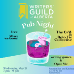 WGA May Pub Night (Edmonton)Wednesday, May 21, 20257-9pm MTRooster Bar & Kitchen, 10732 Whyte aveEdmontonFREE For the May pub night we will be joined by members of the CrW Creative Writing Club from the University of Alberta and MacEwan’s Bolo Tie Collective to play some writer games. Come and bring a pen and paper and let’s create something weird and wonderful together! The open mic will follow at 8pm. All are welcome!