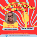Poetry Parlour (Calgary) Tuesday, January 21, 20257:00pm – 9:15pm MTPachamama Soul Flavour Emporium #2110, 380 Canyon Meadows Drive SE, Calgary FREE Join host Ashley Frerichs at the first Poetry Parlour of 2025! Open mic sign-up starts at 7pm. There are limited slots available and will be filled on a first come, first served basis. Our featured reader for January 2025 is the enchanting Ariana Shelmerdine. About the Featured Reader Ariana Shelmerdine knew she wanted to be a writer as soon as she could read & has been writing