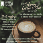 The Calgary Coffee & Chat Returns! Saturday, February 15th, 20259:00am to 10:00am MTFish Creek Library, 3rd floor program room11161 Bonaventure Drive SE Please join host Ashley Frerichs for the return of the Calgary Coffee & Chat, a place for Calgary writers to get together and gab about all things writing! Come enjoy some coffee (and timbits!) and share your recent successes, struggles, and/or bounce ideas and questions off other writers in the community. Sessions will take place one Saturday every two