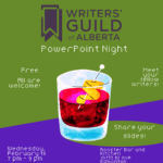WGA Edmonton Pub and Powerpoint NightWednesday, February 19, 20257-9pm MTRooster Bar & Kitchen, 10732 82 ave, EdmontonFREEPoetry open mic sign up at 7. What is a PowerPoint night? Do you have a PowerPoint you want to share? Email [email protected] should be roughly 5 minutes or less.