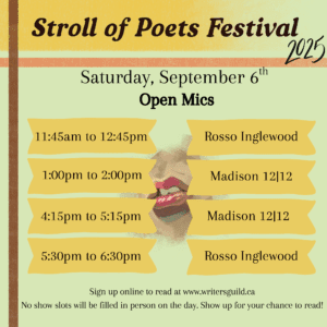 Members of the Writers’ Guild of Alberta, Alexandra Writers’ Centre Society, or Stroll of Poets Society can now sign up. The second wave will open to the public once members of affiliated organizations have been given a chance. No spots will be filled in person so please sign up below.