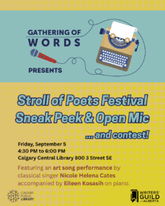 Submit a poem to Ashley at ashley.frerichs@writersguild.ab.ca by Friday, August 29th who will review all the submitted poems and select one for Nicole to improvise! In between musical sets, there will also be an open mic. Come by to be blown away by incredible music and have a chance to practice your poetry ahead of Stroll Fest!