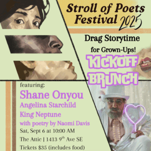 Join us at The Attic for the 2nd annual Stroll of Poets Festival kick-off brunch event! This year features Drag Storytime for Grown-Ups, a drag, storytelling & poetry fusion performance with Shane Onyou, Angelina Starchild & King Neptune, with poetry by Naomi Davis.