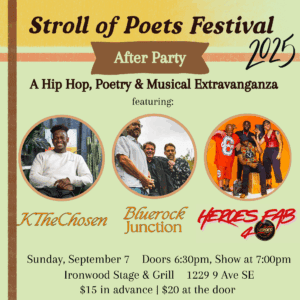 Join us for the 2nd annual Stroll of Poets Festival after party at Ironwood Stage & Grill! Featuring hip hop artists KTheChosen and Sarah Good Medicine in their band Heroes Fab 4 plus local blues/funk/rock band Bluerock Junction!