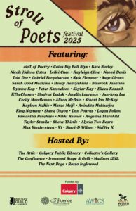 Last year, our Program Coordinator Ashley Frerichs saw an opportunity to revive the Stroll of Poets festival in its original format in Calgary. This is the 2nd annual Stroll of Poets Festival in Calgary, and we hope to make it an annual tradition!